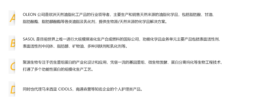 公司主要代理比利時歐荔安(OLEON)、南非沙索(Sasol)、馬來西亞斯特思(CIDOLS)以及江蘇聚源 生物(Jland)等公司的個人護理類產品。